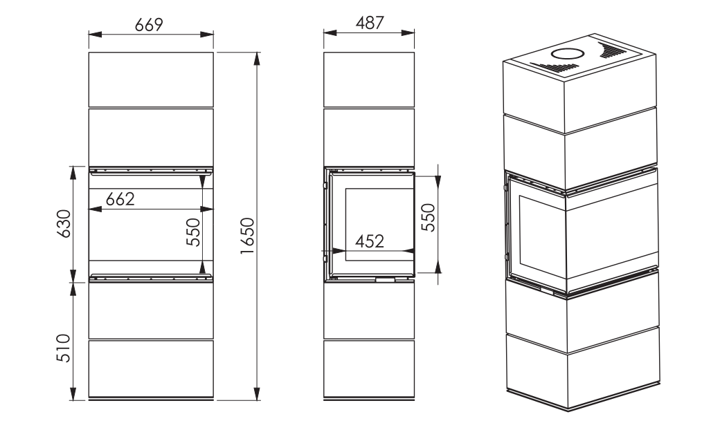 - Şöminenin boyutları (g x d x y): 669 mm x 487 mm x 1650 mm